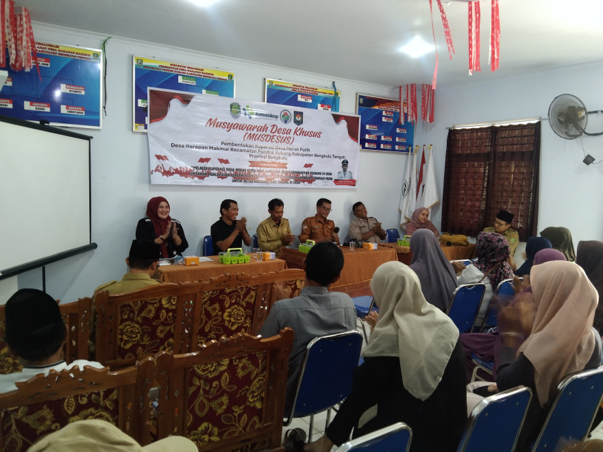 Harapan Makmur, 19 Mei 2025 telah dilaksanakan Musyawarah Desa Khusus ( Musdesus ) pembentukan koperasi merah putih Desa Harapan makmur . Musdesus ini diselenggarakan oleh Badan Permusyawaratan Desa ( BPD ) Desa Harapan makmur yang bertempat di ruang rapat kantor desa harapan makmur. Kegiatan ini dihadiri oleh DPMD Kabupaten Bengkulu tengah, Dinas Koperasi Kabupaten Bengkulu tengah, Camat kecamatan pondok kubang, Pendamping Desa, Perangkat desa, Adat desa, Babinsa, Babinkamtibmas, dari unsur Kesehatan, Pendidikan, Pertanian, dan Masyarakat Desa. Antusiasme masyarakat tampak tinggi saat pembentukan pengurus dan pengawas koperasi yang nantinya akan fokus mengelola usaha strategis seperti gas elpiji, pupuk, dan pembelian hasil pertanian. Tujuan dilaksakannya Musdesus ini untuk menindaklanjuti Intruksi Presiden Nomor 9 Tahun 2025 tentang Percepatan Pembentukan Koperasi Merah Putih. Acara diakhiri dengan penandatanganan Berita Acara pembentukan pengurus koperasi merah putih. Dari hasil musyawarah, sudah ditetapkan susunan pengurus mulai Ketua, Wakil Ketua Bidang, Sekretaris, Bendahara hingga pengawas," ujarnya, Senin (19/5) Sektor usaha yang akan digarap adalah pembuatan gudang pupuk dan logistik, klinik dan juga simpan pinjam, ketiga opsi di atas di dasarkan pada potensi hasil pertanian yang ada di desa yaitu perkebunan sawit. Hasil pertanian ini diyakini bisa mampu mendorong ekonomi desa menuju lebih baik. Setelah pembentukan pengurus, Pemerintah Desa mendorong koperasi segera dibentuk secara hukum melalui notaris. Koperasi Merah Putih diharapkan menjadi model pemberdayaan ekonomi berbasis gotong royong yang memperkuat struktur ekonomi desa di Kabupaten Bengkulu tengah